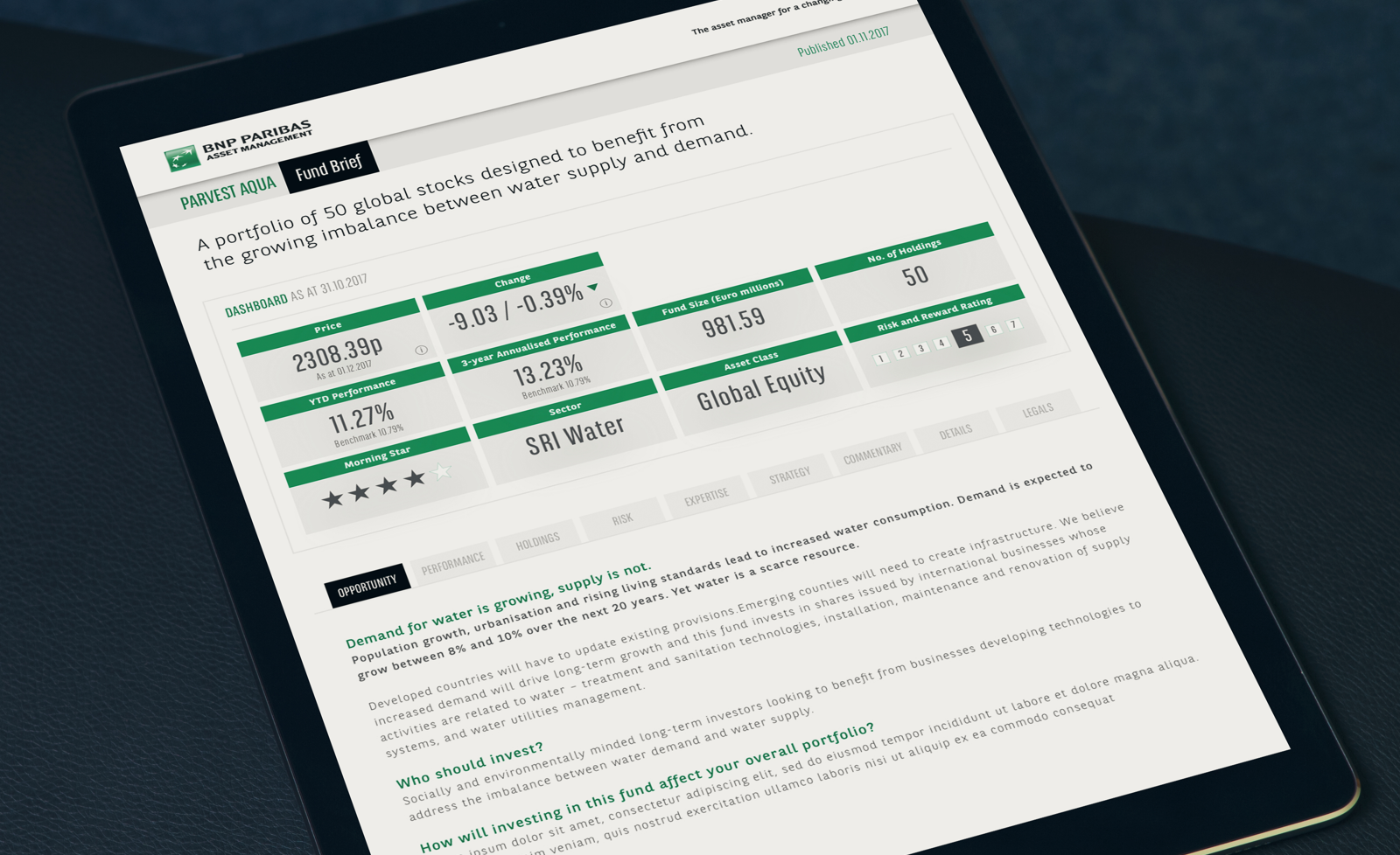 We designed a scalable fund dashboard to give investors an immediate overview of all key data. This is underpinned by a set of clearly labelled modules, all designed to work as standalone components so fund documentation can be created quickly, and to varying degrees of detail, depending on the client need.